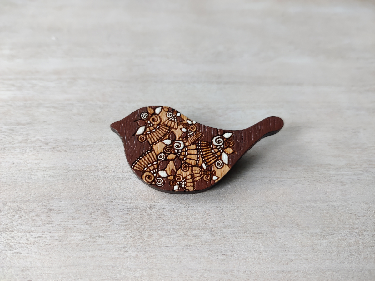 Size | 60 x 30 mm Material | wood, brooch pin Color | brown