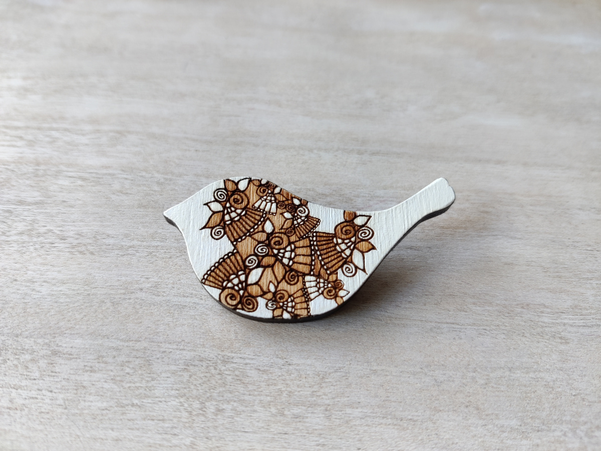 Size | 60 x 30 mm Material | wood, brooch pin Color | white